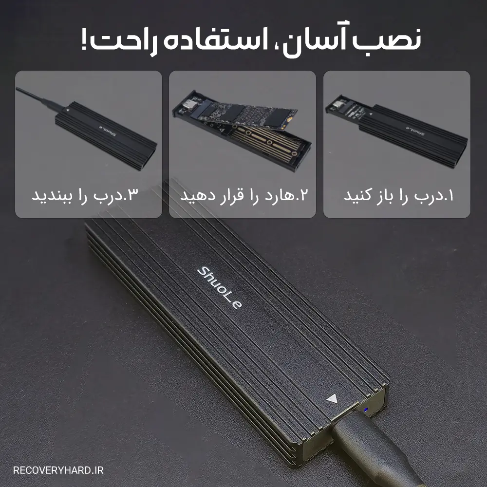 Shuole TP1102 از انواع SSDهای M2 NVME با سایزهای 2230، 2242، 2260 و 2280 پشتیبانی میکنه. فرقی نمیکنه چه SSD داشته باشی، این باکس آمادهست تا بدرخشه! هر حافظهای، هر سایزی، SHUOLE جواب میده!