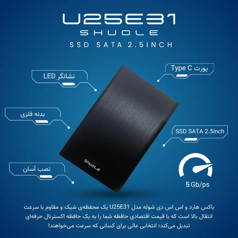 این باکس فقط یه محفظه نیست، یه همراه قابل اعتماد برای دادههای ارزشمند توست! با نصب آسان، سرعت بالا، بدنه آلومینیومی مقاوم و قیمت مقرونبهصرفه، SHUOLE U25E31-T انتخابی هوشمند برای کساییه که بهترینها رو با بودجه مناسب میخوان!